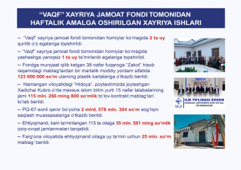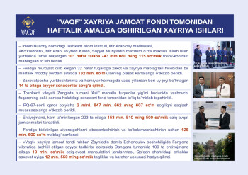 “Vaqf” xayriya jamoat fondi — bu "VAQF" mulklarini yaratish bilan yurtimizda bir asr oldin yuqotilgan diniy qadriyatlarimizni qayta tiklash hamda yaxshilik, ezgulik, ehson va mehr-ulashish uchun tashkil etilgan xayriya fondidir. Maqsadimiz ko‘p asrlik milliy va diniy qadriyatlarimizni asrab-avaylash, dunyo ilm-fani va madaniyati rivojiga ulkan hissa qo‘shgan ajdodlarimizning bebaho merosini o‘rganish, xalqimizga azal-azaldan xos bo‘lgan ma’rifatparvarlik, bag‘rikenglik, mehr-muruvvat, bunyodkorlik kabi ezgu fazilat va qadriyatlarni davom ettirishga ko‘maklashishdir.